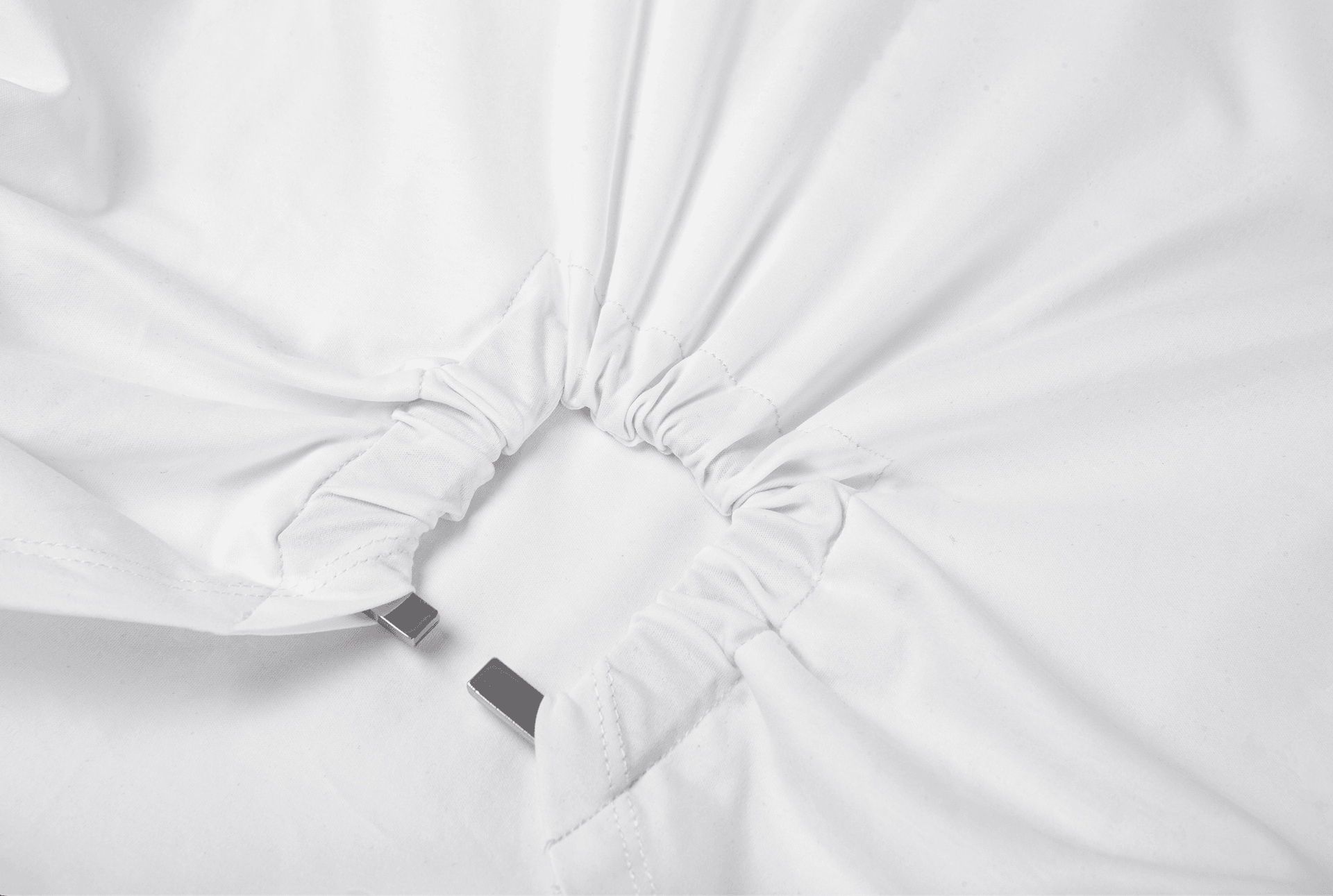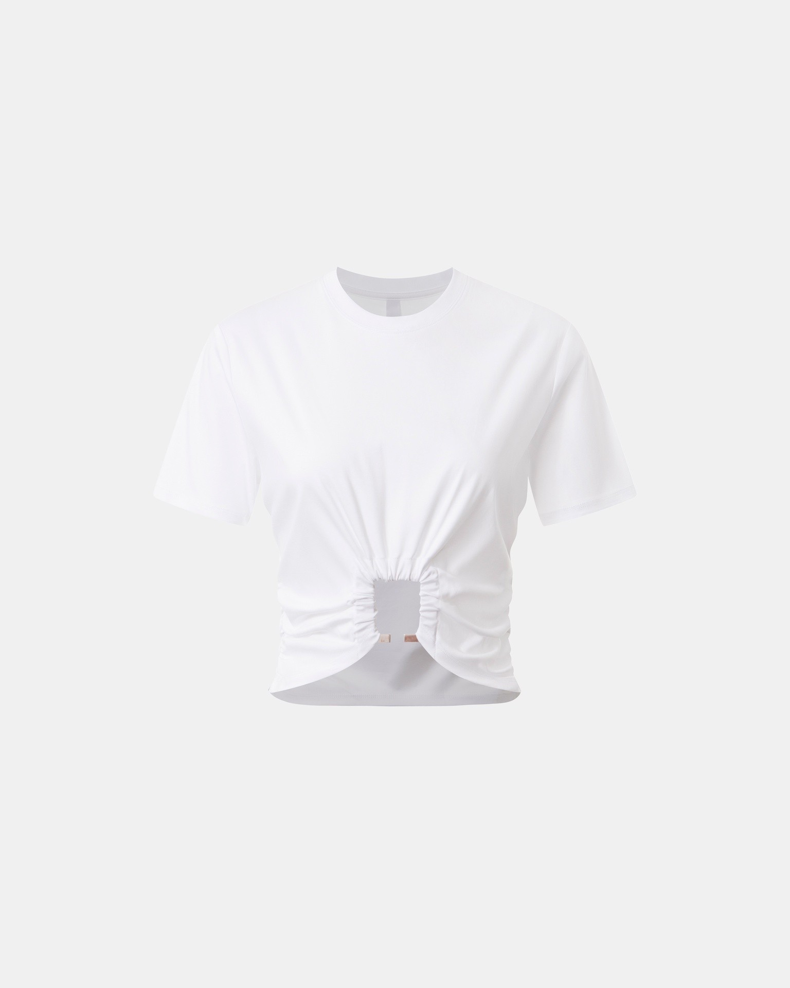 This tee is crafted from an innovative fabric, Mercerized Cotton, which ensures a balance between softness, comfort and sheen. U-shaped metal buckle adds an unique and exquisite cinched-waist silhouette to the overall look. The mid-length sleeves introduce a touch of grace, maintaining an elegant atmosphere in the midst of garment's alluring appeal. Pair it with GRAPHITE pants or GALAXY jeans