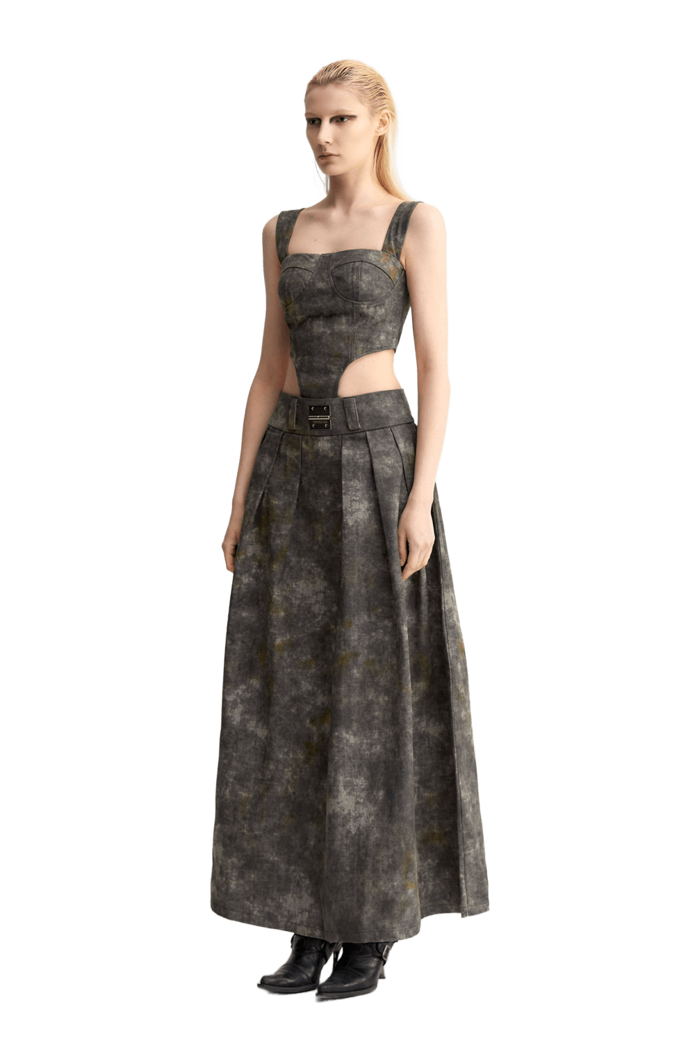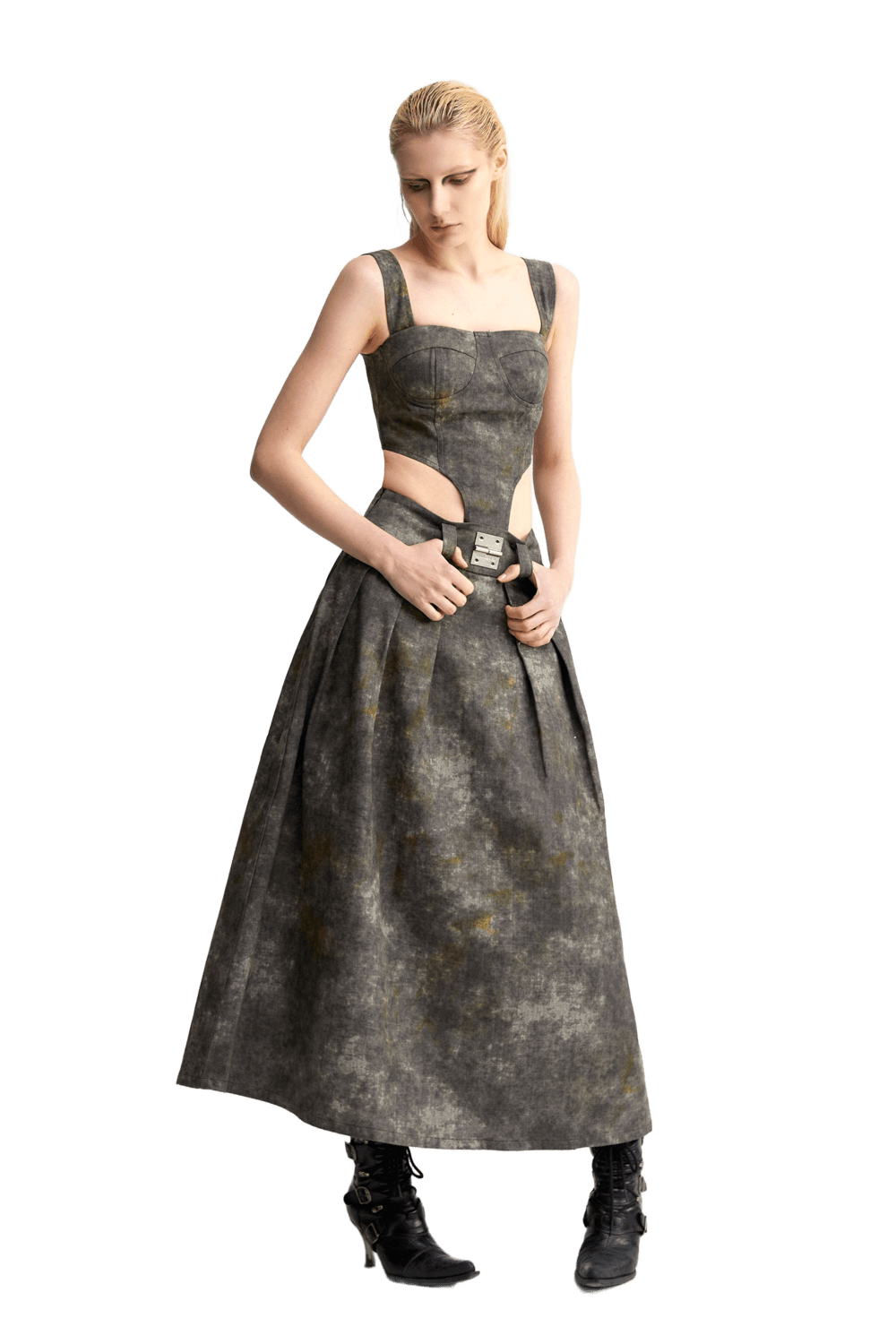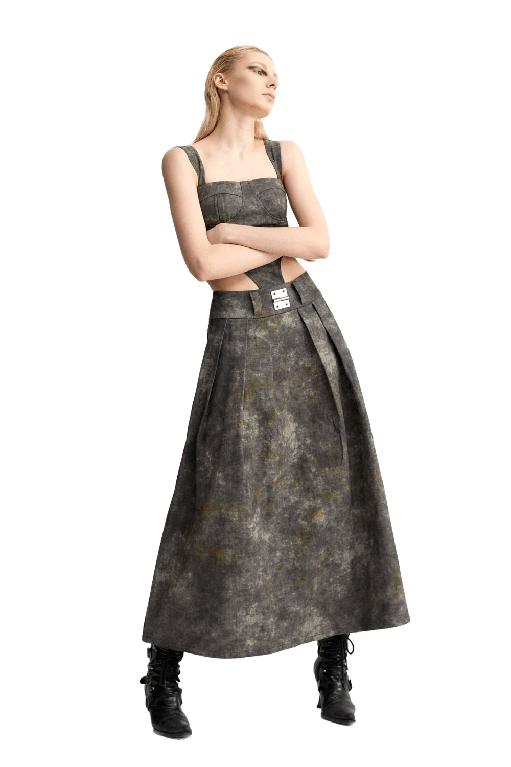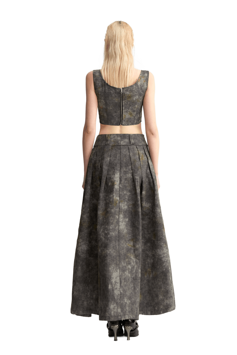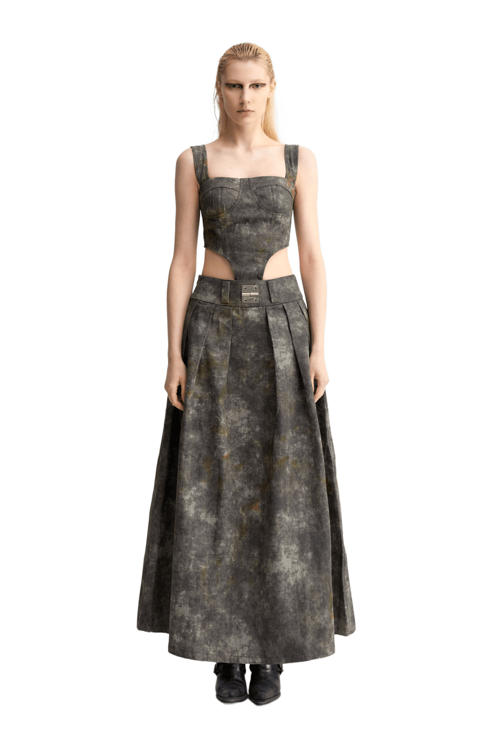 YJ1NGZYZJ DENIM ACID-WASH BUSTIER TOP IN GRAY AND DENIM ACID-WASH LONG SKIRT IN GRAY
